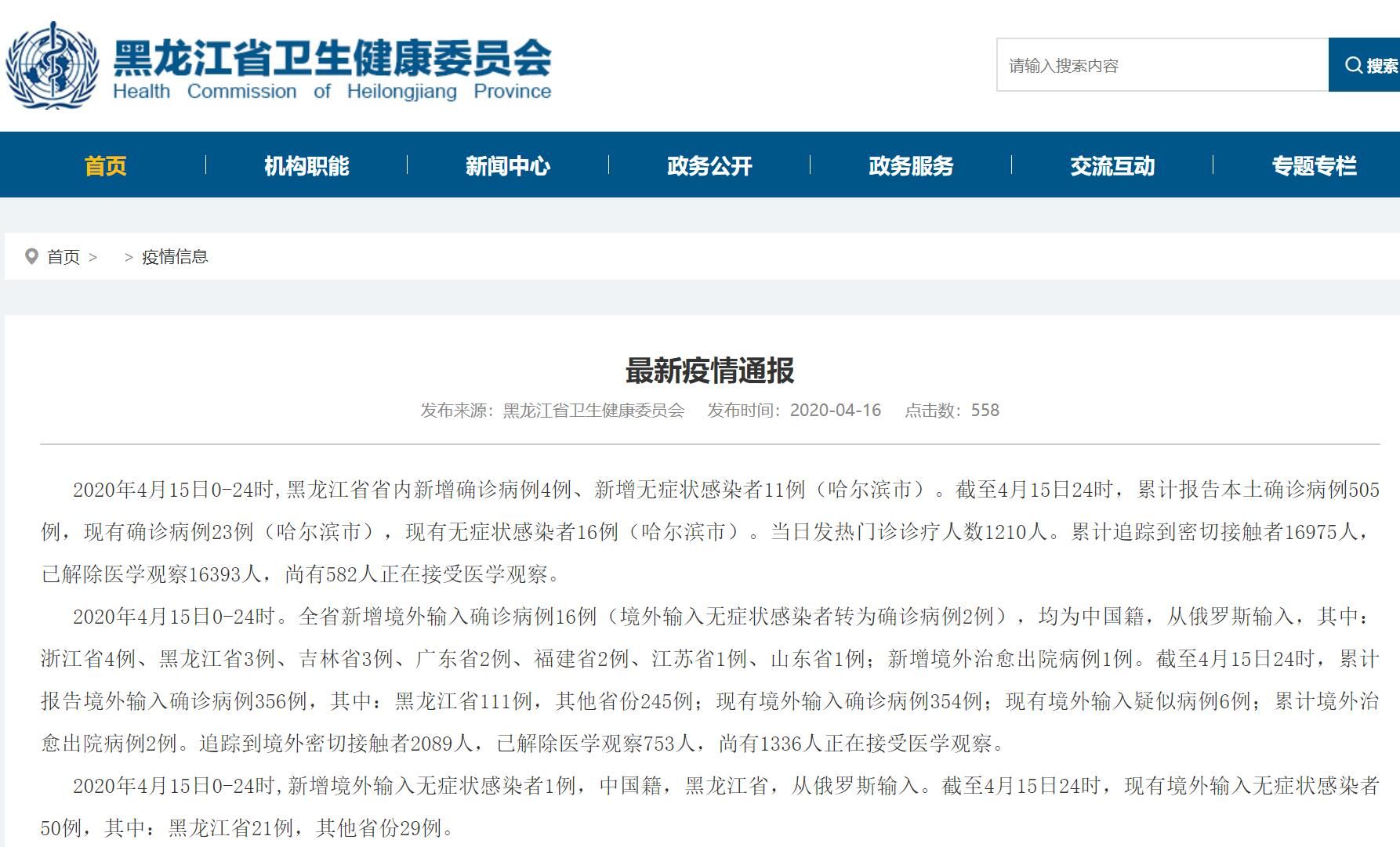 2020年4月15日0-24时。全省新增境外输入确诊病例16例(境外输入无症状感染者转为确诊病例2例),均为中国籍,从俄罗斯输入,其中:浙江省4例、黑龙江省3例、吉林省3例、广东省2例、福建省2例、江苏省1例、山东省1例;新增境外治愈出院病例1例。截至4月15日24时,累计报告境外输入确诊病例356例,其中:黑龙江省111例,其他省份245例;现有境外输入确诊病例354例;现有境外输入疑似病例6例;累计境外治愈出院病例2例。追踪到境外密切接触者2089人,已解除医学观察753人,尚有1336人正在接受医学观察。