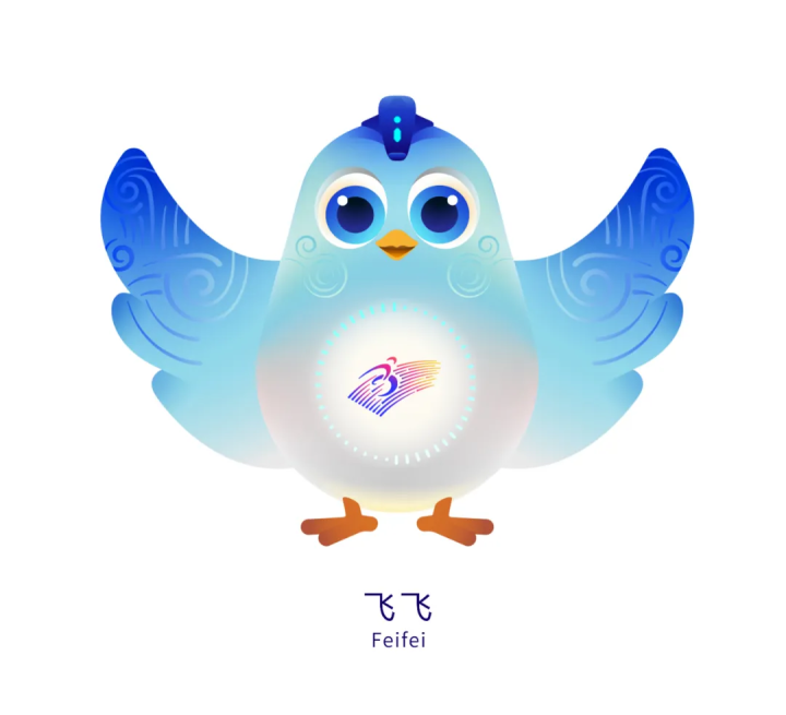 “飞飞”的设计灵感源自良渚文化中“神鸟”的形象。她身上融合了杭州历史人文和科技创新,也承载着人与自然和谐共生的企盼。“神鸟”在中国有着传递佳音的传说,因此,她还是文化和幸福的使者。