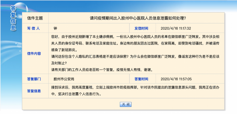 4月16日11时17分,有当地市民在胶州政务网反应,微信朋友圈中流传着出入胶州中心医院的数千人名单,涉及相关人员个人信息,已严重影响个人生活,并被谣传感染了新冠肺炎。