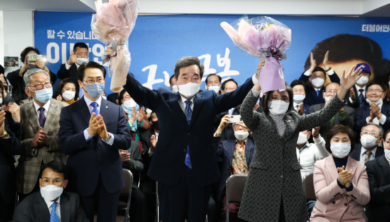 代表韩国执政党参选的李洛渊,得知计票结果后欢呼。(韩联社)