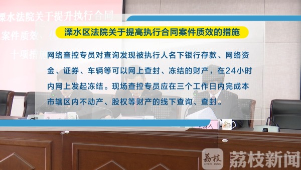 南京溧水区法院出台的提高执行合同案件效率的新规明确:新收的执行合同案件,只要材料齐全,应当在7天内立案;立案后,5天内要完成各项文书的制作,并在3天内将制作好的文书统一送达。新规还明确,执行合同案件立案后,被执行人名下的银行存款、网络资金、证券、车辆等财产,必须24小时内冻结。南京辖区内的股权、不动产等财产,3天内完成查询、查封;辖区外的被执行人财产,1个工作日内通过执行指挥中心平台发起查询、查封委托。