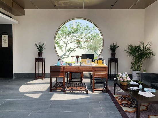 大厅的背景墙上有一块大圆玻璃,春天的暖阳下,阳光会洒进来,透过玻璃看窗外的景色一片翠绿生机的样子,是新中式的风格,是完美借景,也是很适合食客前来打卡的样子。