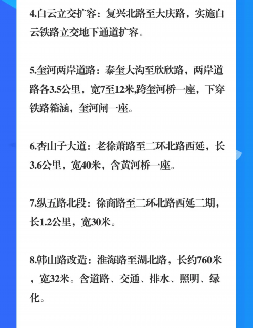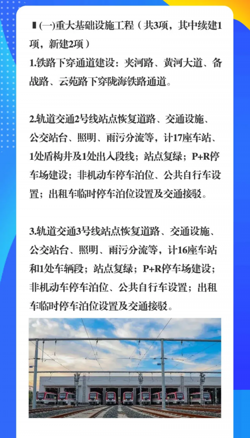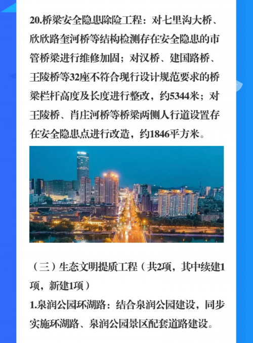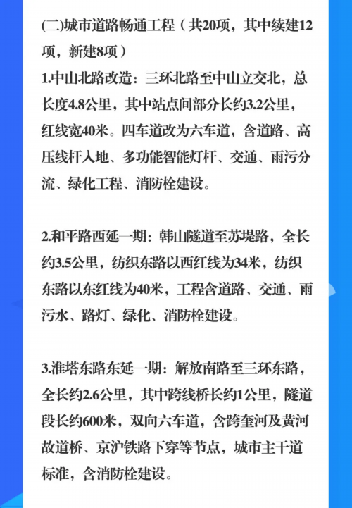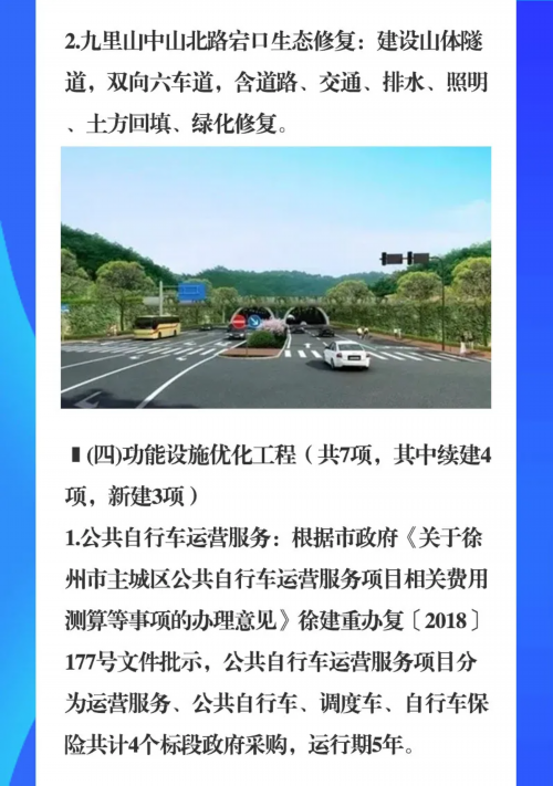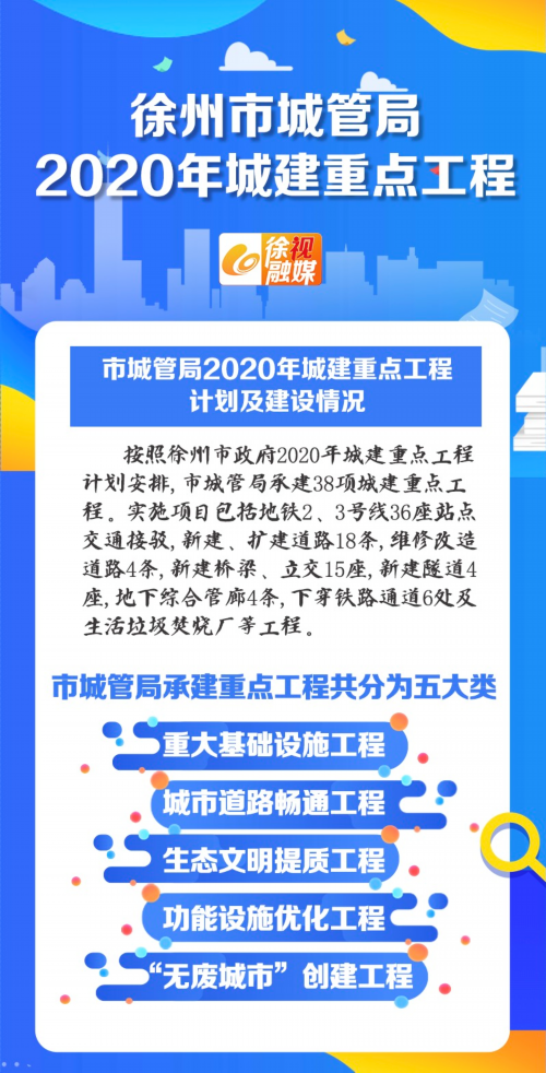 按照徐州市政府2020年城建重点工程计划安排,市城管局承建38项城建重点工程。实施项目包括地铁2、3号线36座站点交通接驳,新建、扩建道路18条,维修改造道路4条,新建桥梁、立交15座,新建隧道4座,地下综合管廊4条,下穿铁路通道6处及生活垃圾焚烧厂等工程。