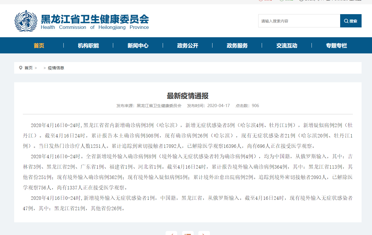 荔枝新闻讯 2020年4月16日0-24时,黑龙江省省内新增确诊病例3例(哈尔滨),新增无症状感染者5例(哈尔滨4例、牡丹江1例),新增疑似病例2例(牡丹江)。截至4月16日24时,累计报告本土确诊病例508例,现有确诊病例26例(哈尔滨),现有无症状感染者21例(哈尔滨20例、牡丹江1例)。当日发热门诊诊疗人数1251人。累计追踪到密切接触者17092人,已解除医学观察16396人,尚有696人正在接受医学观察。