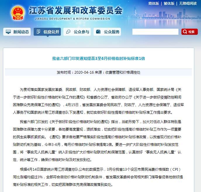 我苏网讯 为贯彻落实国家发展改革委、民政部、财政部、人力资源社会保障部、退役军人事务部、国家统计局《关于进一步做好阶段性价格临时补贴工作的通知》和省委办公厅、省政府办公厅《关于进一步做好疫情防控期间困难群众兜底保障工作的通知》,4月15日,省发展改革委会同民政厅、财政厅、人力资源社会保障厅、退役军人事务厅和国家统计局江苏调查总队下发通知,就切实做好阶段性提高价格临时补贴标准工作提出要求。