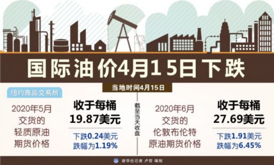 截至当天收盘时,纽约商品交易所5月交货的轻质原油期货价格收于每桶19.87美元,与前一日收盘价相同。同日,6月交货的伦敦布伦特原油期货价格上涨0.13美元,收于每桶27.82美元,涨幅为0.47%。