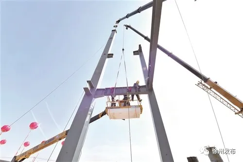 4月13日下午,淮海国际博览中心项目一期主体钢结构完成吊装,标志着主体结构基本完工。