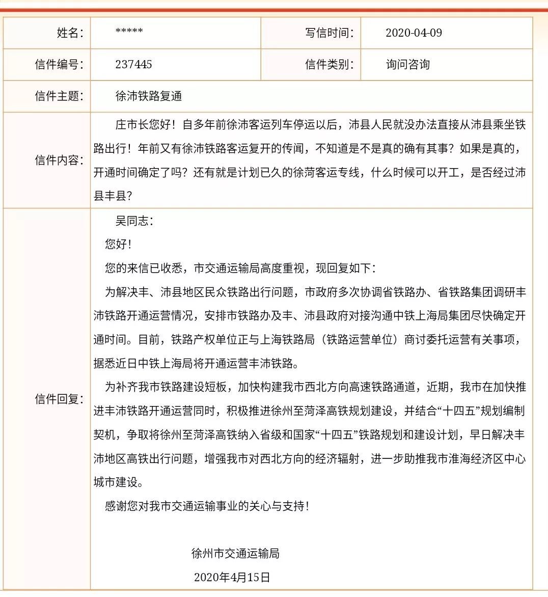 咨询“丰县的铁路什么时间能开通?”