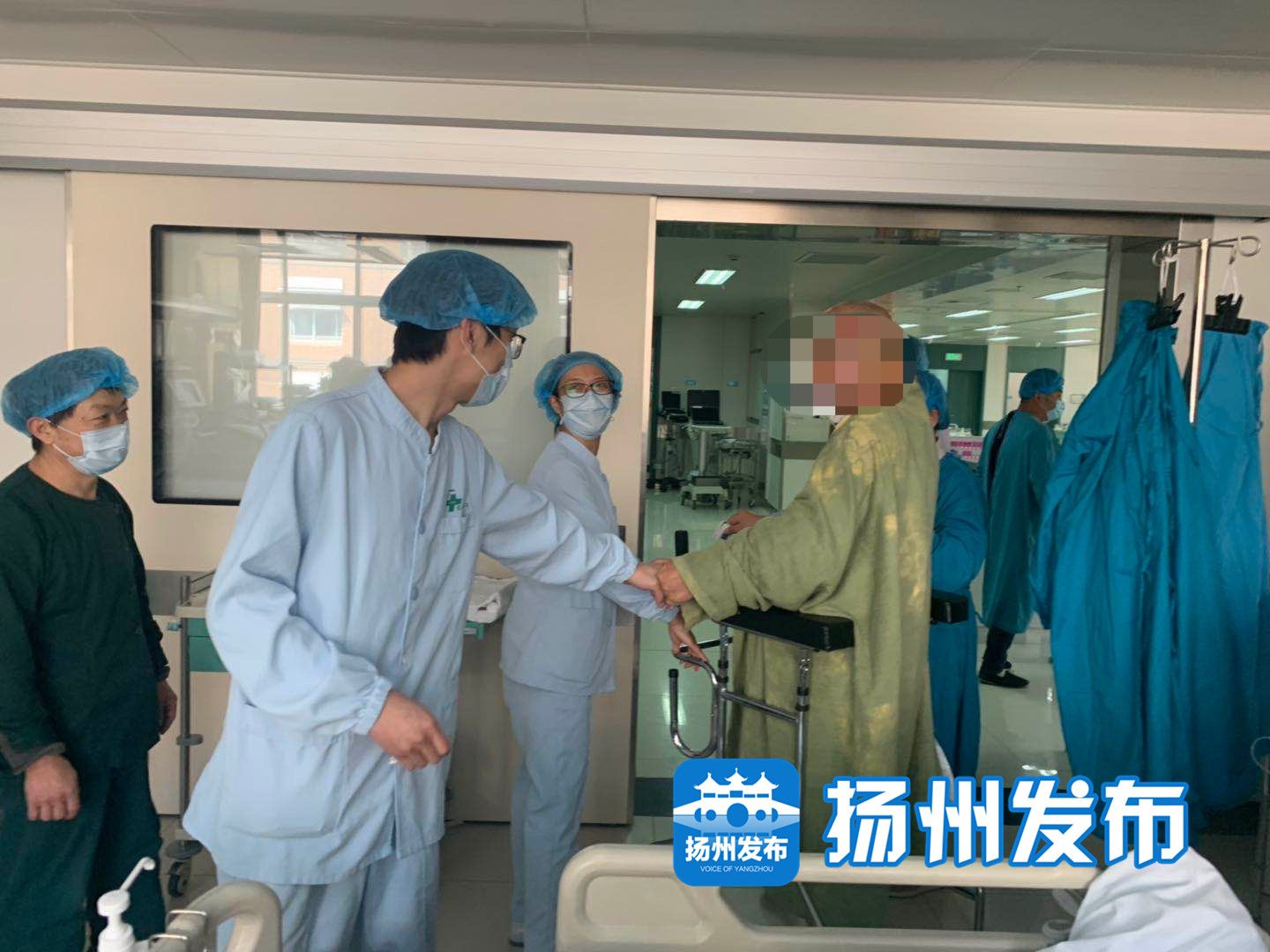 出院前,患者握住每一位医护人员的手,表达感谢。谈定玉说,一开始患者情绪不太稳定,医生护士就会主动跟他聊天,时常会与患者说起全国疫情态势,宽慰患者住进EICU就相当于在家中隔离、比较安全。随着病情稳定,患者也会用积极的眼神和乐观的态度回应医生护士。当患者封堵气切套管后,他开口说的第一句话就是“谢谢!”