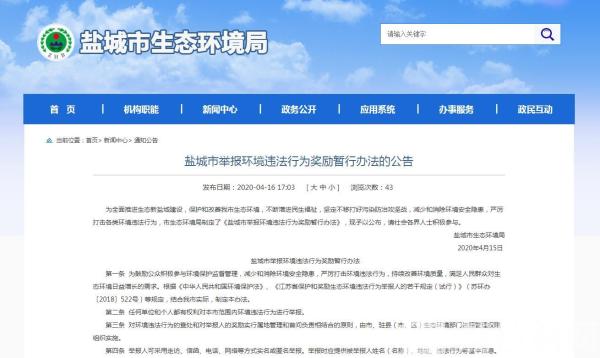 我苏网讯 为全面推进生态新盐城建设,保护和改善盐城市生态环境,鼓励公众积极参与环境保护监督管理,坚定不移打好污染防治攻坚战,盐城市生态环境局制定《盐城市举报环境违法行为奖励暂行办法》。《办法》自今年4月15日起实施,举报人提供的有效举报,经核实后,最高可给予10000元奖励。