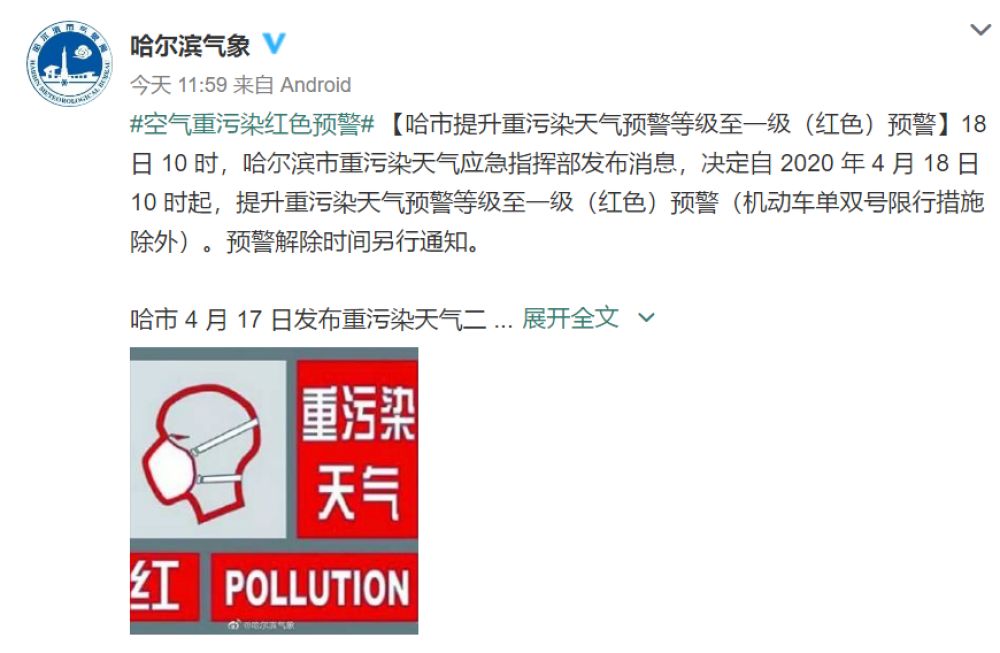 哈市4月17日发布重污染天气二级(黄色)预警后,根据监测实况和预报,未来哈尔滨市区相对湿度大,扩散条件极差,受本地污染源排放和前期污染累积影响,预计未来空气质量将持续重度 - 严重污染。根据《哈尔滨市重污染天气应急预案 (2019年修订 ) 》规定,哈尔滨市重污染天气应急指挥部决定自2020年4月18日10 时起,提升重污染天气预警等级至一级(红色)预警(机动车单双号限行措施除外)。预警解除时间另行通知。