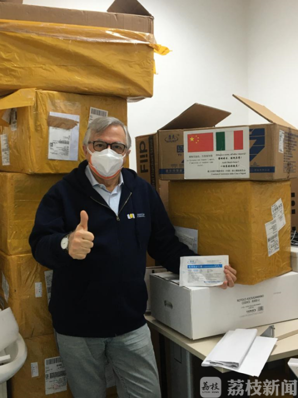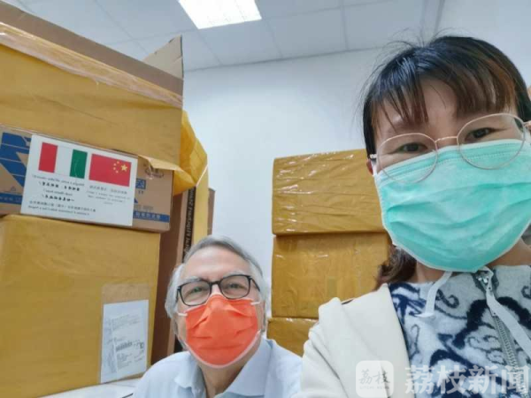 那不勒斯国家肿瘤研究中心Muto教授与爱心援助委员会境外联络组倪雪君在防护物资前合影