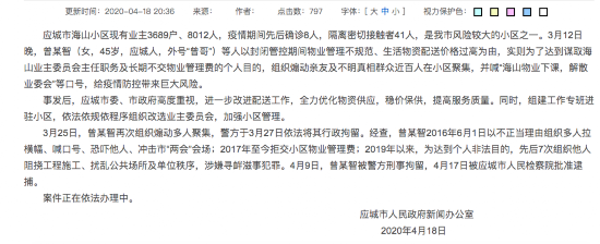 荔枝新闻讯 据应城市政府消息,应城市海山小区现有业主3689户、8012人,疫情期间先后确诊8人,隔离密切接触者41人,是我市风险较大的小区之一。3月12日晚,曾某智(女,45岁,应城人,外号“曾哥”)等人以封闭管控期间物业管理不规范、生活物资配送价格过高为由,实则为了达到谋取海山业主委员会主任职务及长期不交物业管理费的个人目的,组织煽动亲友及不明真相群众近百人在小区聚集,并喊“海山物业下课,解散业委会”等口号,给疫情防控带来巨大风险。