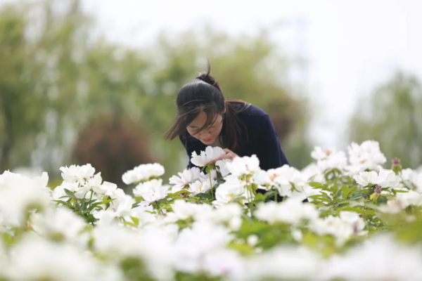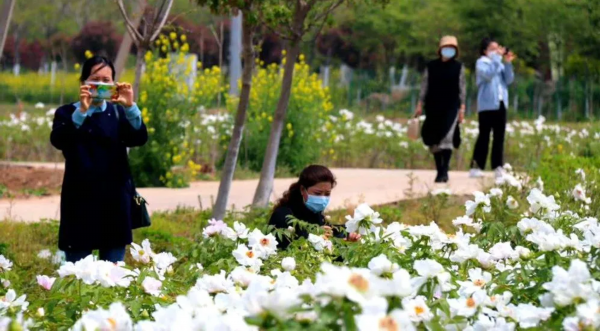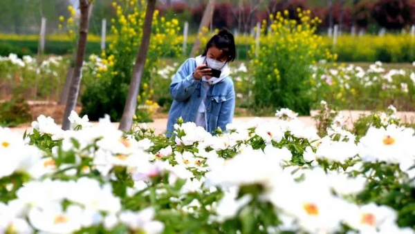 谷雨时节看牡丹。在何桥镇宗庄村黄河故道一侧的永春牡丹园里,五百亩白牡丹花进入盛开期,园内花香芬芳,百花争艳,吸引众多游客或赏花、或素描、或摄影,沉醉于“花色”之中。