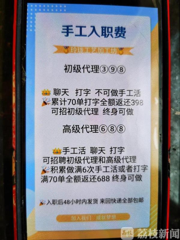 “那段时间在家隔离,没工作没收入,本以为这是个在家就能挣钱的好机会,没想到还被骗子骗钱,真是太可恨了!”今年2月28日,受害人范某向淮安市清江浦警方报警称,自己通过某社交平台看到一则手工活招工信息,她按照“招聘方”要求,线上缴纳696元代理费后,接到了十字绣、串珠子等简单的手工任务。没想到的是,接下来几天的任务量急剧上升,自己根本无法完成,于是范某打算放弃这份工作。但当她要求退还代理费时,却被告知不完成任务不予退款,再进一步交涉却发现自己已经被拉黑。