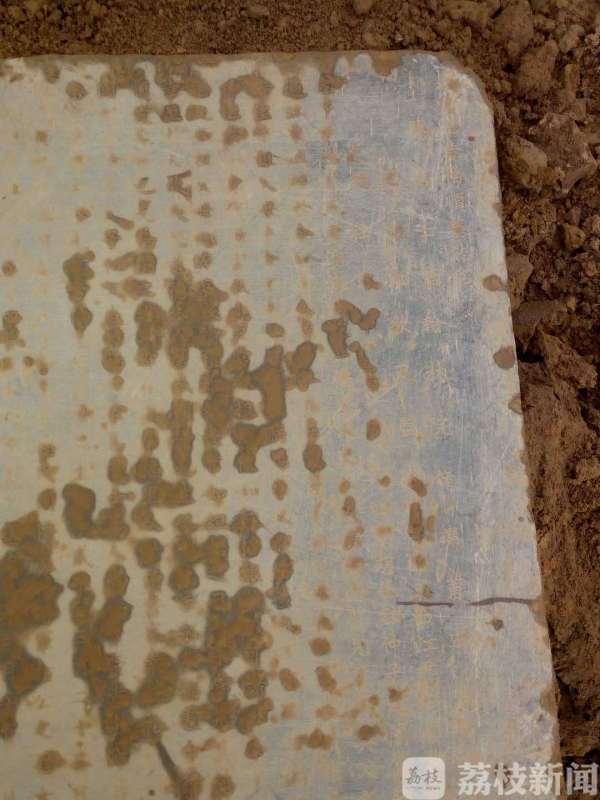 接到电话后,泰州博物馆考古专家随即到现场进行查看,确认这是一块明代的墓志铭。考古专家清理现场后发现,在现场还残留着几块一同挖出来的棺木板子。