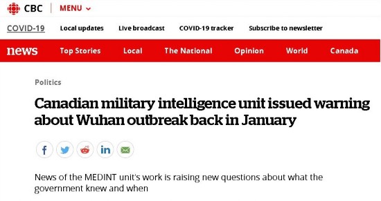 △《加拿大军方情报部门早在1月份发出武汉爆发疫情的警告》——加拿大广播公司
