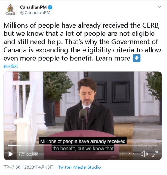 △特鲁多总理4月15日宣布已有数百万加拿大人收到了政府的疫情应急福利金