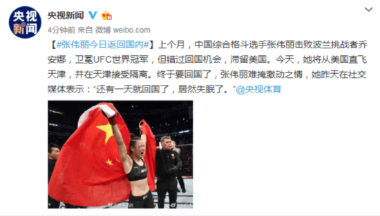 上个月,中国综合格斗选手张伟丽击败波兰挑战者乔安娜,卫冕UFC世界冠军,但错过回国机会,滞留美国。今天,她将从美国直飞天津,并在天津接受隔离。终于要回国了,张伟丽难掩激动之情,她昨天在社交媒体表示:“还有一天就回国了,居然失眠了。”