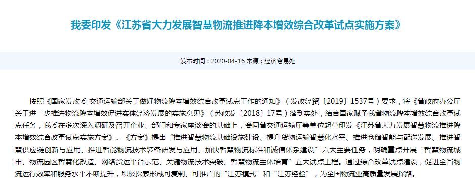 按照《国家发改委 交通运输部关于做好物流降本增效综合改革试点工作的通知》(发改经贸〔2019〕1537号)要求,将《省政府办公厅关于进一步推进物流降本增效促进实体经济发展的实施意见》(苏政发〔2018〕17号)落到实处,结合国家赋予我省物流降本增效综合改革试点任务,我委在多次深入调研及召开企业、部门和专家座谈会的基础上,会同省交通运输厅等单位起草印发《江苏省大力发展智慧物流推进降本增效综合改革试点实施方案》。《方案》提出“推进智慧物流基础设施建设、提升货物运输智慧化水平、推进仓储智能与配送发展、推进智慧供应链创新与应用、推进智能物流技术装备研发与应用、加快智慧物流标准和诚信体系建设”六大主要任务,明确重点开展“智慧物流城市、物流园区智慧化改造、网络货运平台示范、关键物流技术突破、智慧物流主体培育”五大试点工程。通过综合改革试点建设,促进全省物流运行效率和服务水平不断提升,积极探索形成可复制、可推广的“江苏模式”和“江苏经验”,为全国物流业高质量发展探路。
