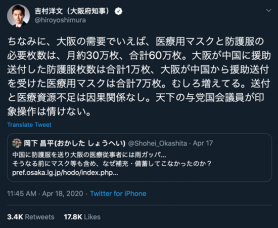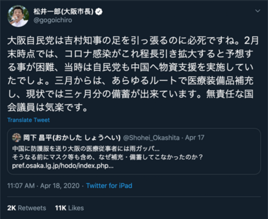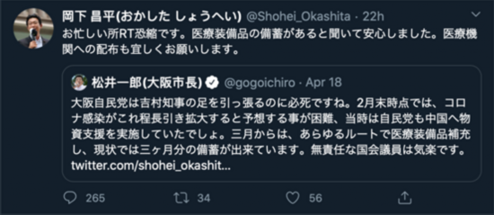 “大阪的自民党议员们真是卯足了劲的要拖累吉村知事啊。2月末的时候,我们也难以想象新冠肺炎疫情会扩大到如此严重的地步,当时自民党也向中国提供了物资援助对吧。三月开始,我们用尽了各种方式来补给医疗装备,目前我们储备了大约3个月的医疗物资。身无重则的国会议员倒是很轻松呢。”