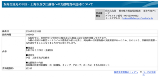 冈下昌平推文中转发的这份大阪府公示究竟说了什么呢?公示网页显示,今年2月,中国的新型冠状病毒疫情暴发后,由于与中国上海市和江苏省缔结了友好交流关系,大阪府向两地捐赠医用防护服套组(包括防护服、防护帽、手套和护目镜)各5000套。网站信息还显示,这批捐赠的提供时间是2月20日。