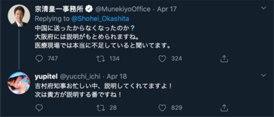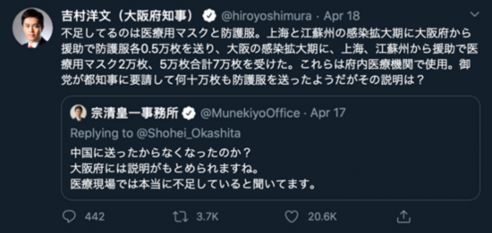 “说到大阪现在需要的医疗资源,目前我们必须的医用口罩数目是每个月30万枚、必须的医用防护服数目是每个月60万套。大阪提供给中国的援助是防护服1万套,大阪收到的中国给的援助是医用口罩7万枚。反而是我们收到的援助更多。我们向中国捐赠医疗物资和我们现在面临医疗物资短缺,这两件事毫无因果关系,作为国会议员,您这波节奏带的可真令人难为情。”