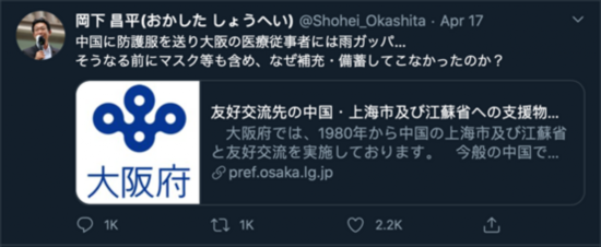 4月17日,日本自民党议员冈下昌平在推特上转发了一份大阪府的公示声明,并配文质问:
