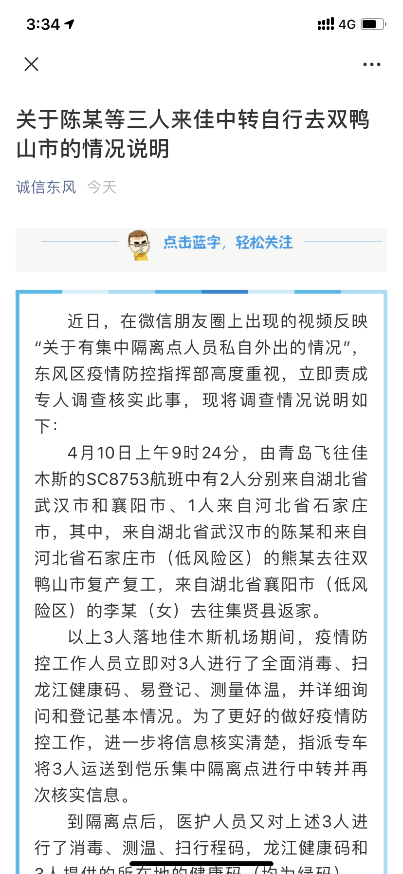 4月10日上午9时24分,由青岛飞往佳木斯的SC8753航班中有2人分别来自湖北省武汉市和襄阳市、1人来自河北省石家庄市,其中,来自湖北省武汉市的陈某和来自河北省石家庄市(低风险区)的熊某去往双鸭山市复产复工,来自湖北省襄阳市(低风险区)的李某(女)去往集贤县返家。