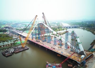 昨天,中铁四局承建南京南部新城承天大道跨外秦淮河钢拱桥精准合龙。