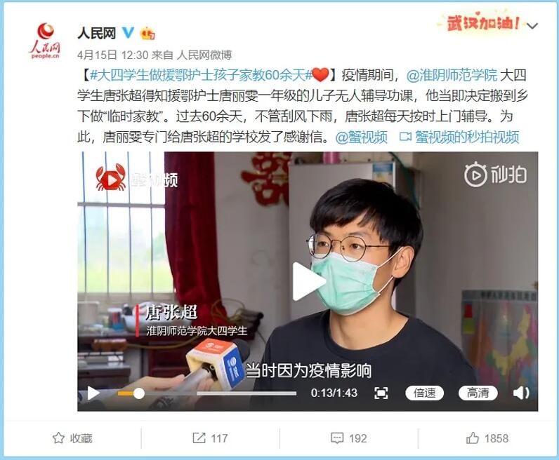 4月18日晚,中央电视台综合频道晚间新闻栏目报道了淮阴师范学院大学生唐张超为援鄂护士孩子辅导功课65天的温暖故事,报道时长57秒。