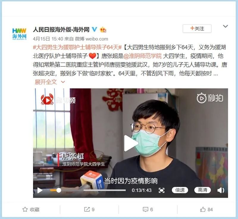 唐张超是淮阴师范学院化学化工学院大四学生,回老家探亲时发现邻居小孩邵禹涵的妈妈跟着援鄂医疗队去了武汉,爸爸又出差在外,于是他就主动留在爷爷奶奶家为禹涵辅导功课,从数学、语文到英语,一教就是65天。唐张超说,其实是他妈妈在保卫我们,我为她孩子辅导功课,只是在后方加了一把劲,让她能安心在武汉。现在,邵禹涵妈妈已经完成任务返回。唐张超也回到家中,专心准备毕业论文答辩和公务员面试。