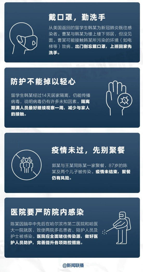 经分析,黑龙江省两起聚集性感染病例都是以家庭为单位的人员聚集行为造成的。