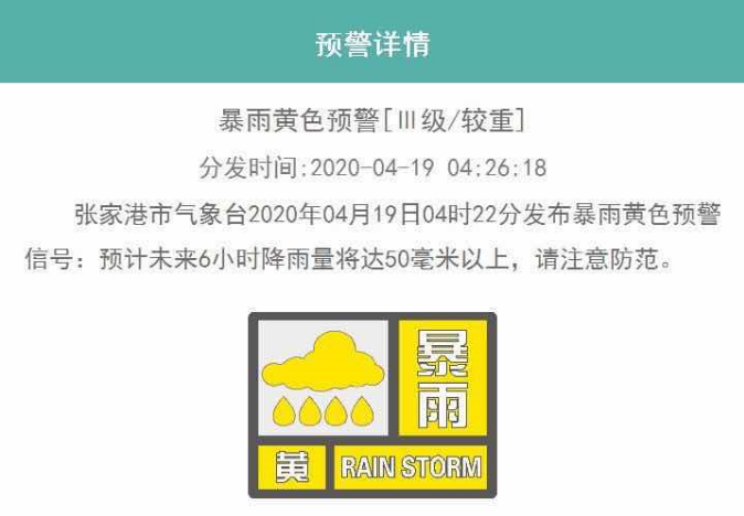 说谷雨,雨就到。今天04:22,张家港气象台发布了暴雨黄色预警信号。