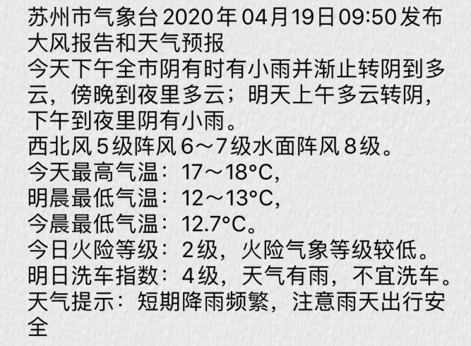 苏州市气象台,在今天早上09:50发布大风报告和天气预报,今天下午全市阴有时有小雨,风也很大。