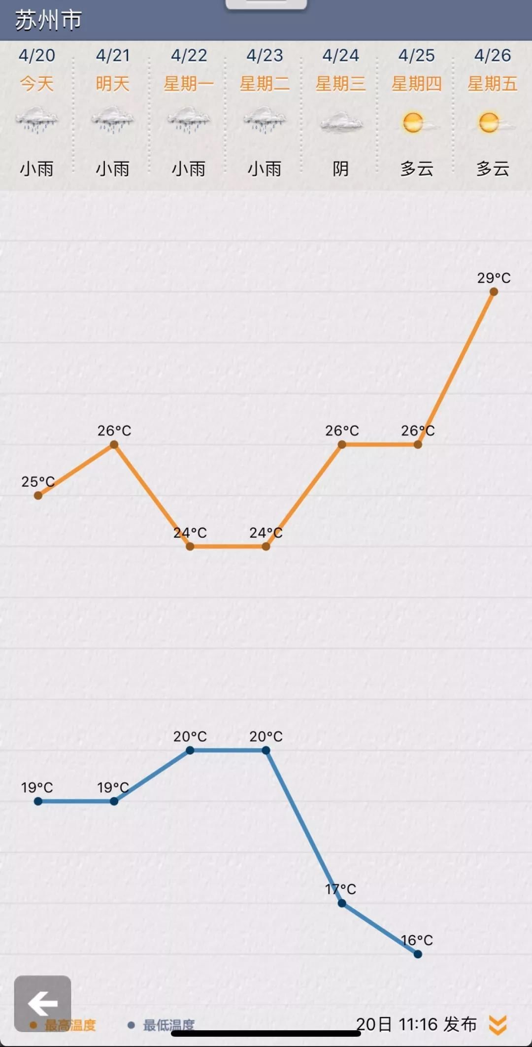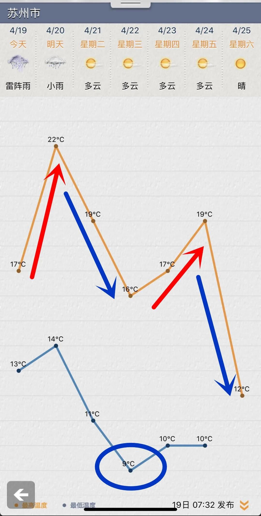 下周二起,受新一股冷空气的影响,苏州的气温又将进入过山车模式,4月22日的最低温度,将跌回个位数——9℃。而4月25日,最高温度仅为12℃,跟明天相比,相差近10℃左右。
