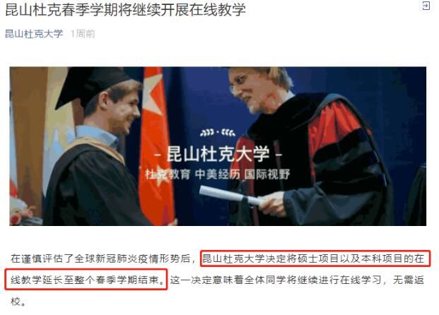 上个月底,昆山杜克大学在官微上宣布,本学期,全体学生进行线上教育,无需返校。