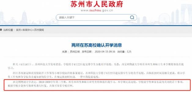 据苏州市人民政府官网4月15日消息,西交利物浦大学决定,2019-2020学年第二学期,所有本科生和硕士研究生将继续在线学习,本学期无需返校。