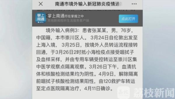经过核实,患者张某某,男,76岁,崇川区人。3月24日自伦敦出发至上海入境, 3月25日,按境外人员转运流程接转回通,3月26日2点抵达小海检疫点接受检测,并由专用车辆转运至崇川区集中医学观察点隔离观察。4月9日,解除隔离前,核酸检测结果阳性,由120救护车转运至定点医院隔离治疗,4月11日确诊。