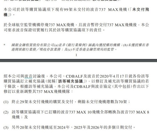 国银租赁表示,已订购的波音737 MAX 10飞机全部转换为波音737 MAX 8 飞机,20架未交付飞机延至2024年、2025年及2026年交付。