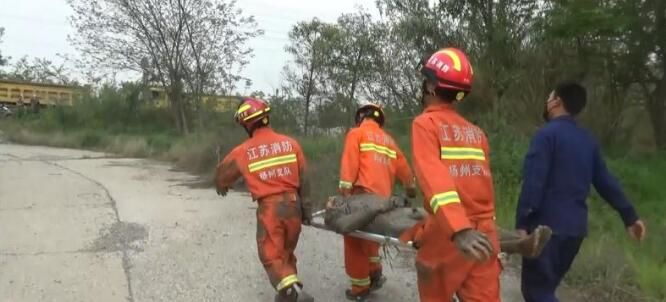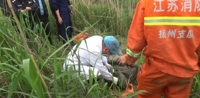 接到报警后,江都区张纲派出所民警第一时间赶到现场。民警在现场看到,一满脸淤泥人身陷泥潭中。在被困人员旁边,躺着一拐杖,拐杖上面系着一遛狗绳。在遛狗绳的另一端,一条黑色中华田园犬,正守在淤泥塘边,不停狂吼。