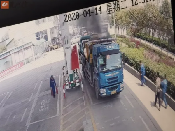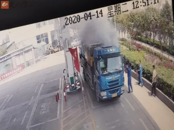 4月14日下午,一辆拉着电动三轮车的货车在中石化贾汪区韩园加油站加油时,突然着火,瞬间黑烟四起,危急时刻,站内员工临危不惧,紧急处置!