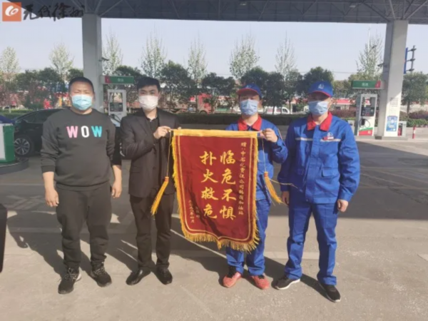 4月17号,货车车主给加油站送来锦旗表示感谢。车主说,当时货车上拉了价值十万多的电动三轮车,幸亏加油站3位员工及时出手,挽救了损失,也挽救了司机的生命。