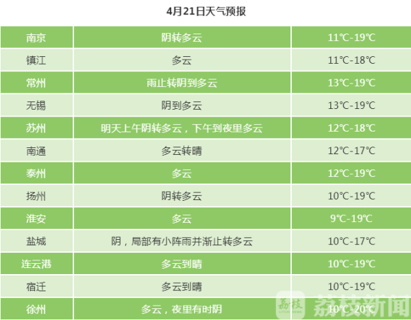 4月20日夜里,沿江和苏南地区阴有小雨,其它地区多云,明天苏南地区阴转多云,其它地区多云。全省偏东风3-4级。明晨最低温度:沿江和苏南地区11-12℃,其它地区9-10℃。明天最高温度:本省东部地区17℃左右,其它地区18-19℃。