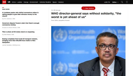 “我们需要世界各国团结起来,这建立在各国国内保持团结的基础上。如果做不到这两点——没有各国国内和各国之间的团结——相信我们,最糟糕的时刻就在我们前面。让我们阻止这场悲剧。这是一种许多人仍不了解的病毒。”CNN称,眼下不少国家都在考虑放松各自的限制措施,比如美国多州正在考虑重新开放,谭德赛在20日的记者会上发出这样的呼吁。