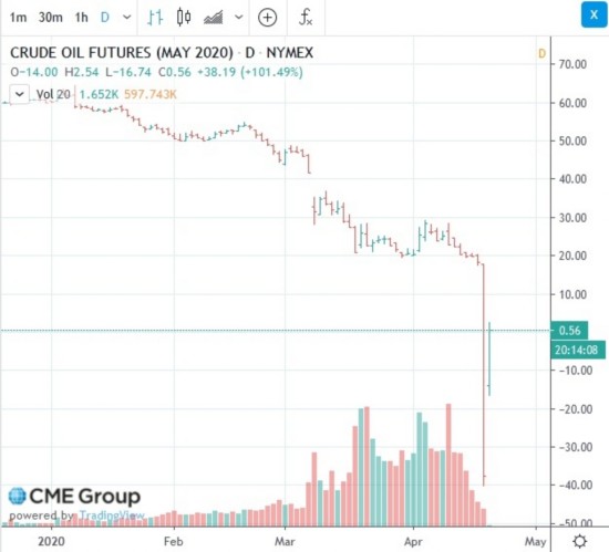 当地时间周一,纽约商品期货交易所WTI 5月原油即期合约收盘下跌55.90美元,至-37.63美元/桶,为国际原油期货史上首次收于负值,跌幅高达305.97%。在当天交易中,WTI 5月即期合约最低曾跌至-40.31美元/桶。油价跌至负值,这意味着卖方需要向买方支付费用,才能让买方从其手中拿走原油。