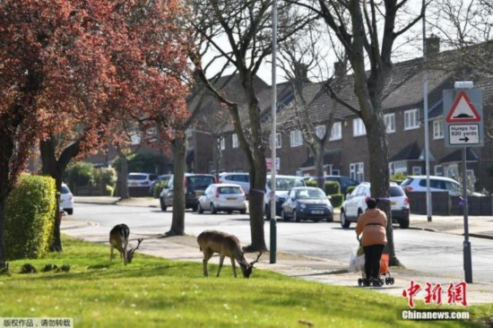 当地时间4月4日,英国执行“社交疏离”措施期间,一名妇女经过一群在伦敦东部哈罗德山(Harold Hill)某住宅小区草坪上吃草的小鹿。
