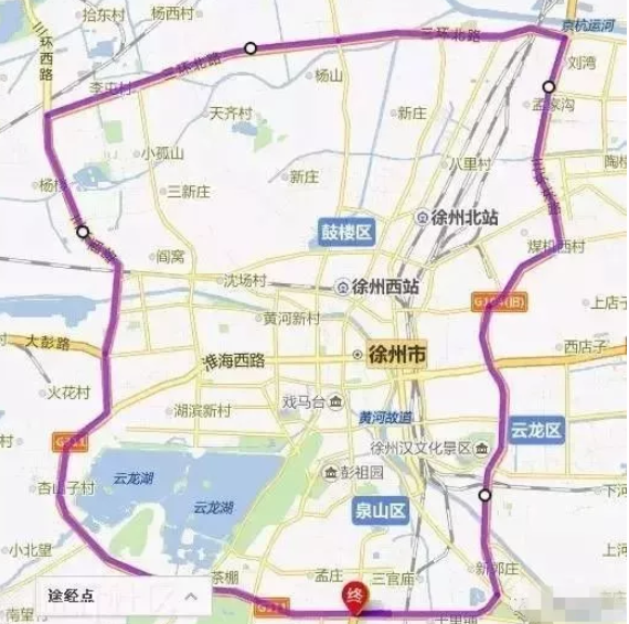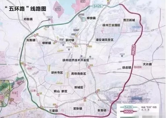 徐州五环,东环长约33.5公里,北环长约42.7公里,西环长约39公里,南环长约20公里。五环公路拟按一级公路的技术标准修建,设计速度100公里/小时,路基宽26米,双向4车道;均为沥青混凝土路面。
