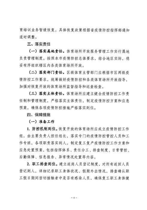 (一) 落实属地责任。体育场所开放服务管理工作实行属地负责管理制度。按照本市疫情防控总体要求,结合地区实际,稳妥有序组织辖区内各类体育场所开放。