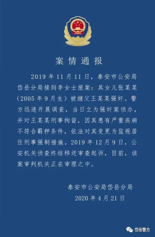 荔枝新闻讯 4月21日,山东泰安市公安局岱岳区分局官方微信“岱岳警方”发布案情通报,通报称2019年11月11日,泰安市公安局岱岳分局接到李女士报案:其女儿张某某(2005年9月生)被继父王某某强奸。警方迅速开展调查,当日立为强奸案侦办,并对王某某刑事拘留,因其患有严重疾病不符合羁押条件,依法对其变更为监视居住刑事强制措施。2019年12月9日,公安机关侦查终结移送审查起诉,目前,该案审判机关正在审理之中。